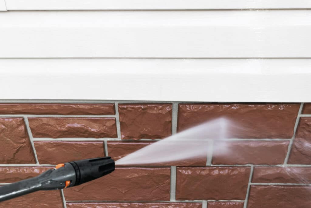 Before you start, figure out what your skirting is made of because vinyl, metal, faux rock, or fiber cement all respond differently. When in doubt, go conservative: use a wide-angle nozzle (think 25–40 degrees) and keep the pressure lower than you’d use on concrete. Another great rule? Start on the lowest effective pressure and work up only if needed. Also, stand back 2–3 feet and test a small, hidden section first. If you see warping, chipping, or water sneaking behind panels, dial it back.